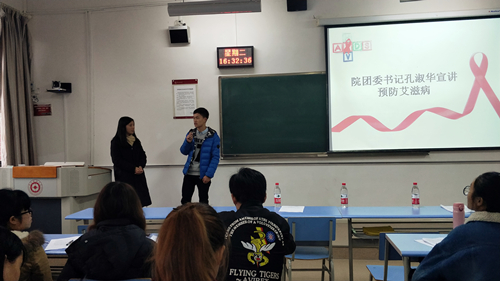 宣讲会首先由主持人赵丹丹介绍出席本次会议的领导,并对中国艾滋病的现状做了一个简单的概述。接下来由院党委副书记陈劲松致辞,副书记强调大学生要正确认识艾滋病,关爱艾滋病患者,减少对艾滋病患者的歧视。随后主持人播放了介绍艾滋病的视频,同学们从中对艾滋病有了初步的认识。紧接着院团委书记孔淑华老师向各位同学进行预防艾滋病宣讲,孔老师向同学们讲述了艾滋病相关的一些问题和预防方法,再采用小组讨论的方式,让同学们围绕此话题展开讨论,讨论结束后派每个小组派代表向大家汇报自己小组的讨论结果,以计分的形式选出优胜组,同学们从讨论问题到汇报成果的过程中对艾滋病有了更深入的了解与认识。