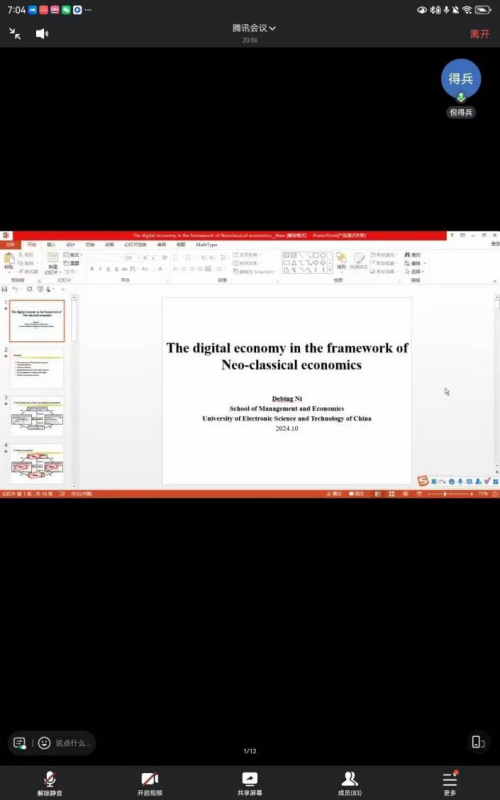 对倪得兵教授表示热烈的欢迎,并对倪得兵教授的教育背景、工作简历、研究方向及学术成果进行了介绍。随后,倪得兵教授围绕“新古典经济学框架下的数字经济”这一主题进行了分享与交流。倪得兵教授以一种研讨会的方式展开,从新古典经济学框架的回顾、数据来源、数据的产权划分、数据化带来的后果、数字经济是否适应新古典经济学的体系、拓展分析等多个层面进行了全面的分享。