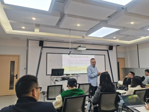 贺教授深入浅出,以自己的学术研究历程为切入口来讲解研究方法中的定性研究和定量研究。他强调科学研究时提出问题的重要性以及哲学基础对问题找寻的贡献;他进一步强调,通过系统地采集分析数据、采用可行性的科学方法和研究工具,研究人员可以在避免偏见的同时,更好地描述和预测现象,找到现象背后的规律。期间,和同学们亲切交谈、沟通和交流,答疑解惑。