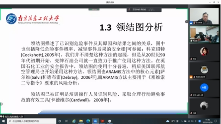 巩在武教授以当前新冠疫情风险为切入点,从风险分析、风险评价、风险控制与风险降低等八个方面向同学们展示了风险评估理论的全貌,并以领结图分析为例具体讲解了实际应用。