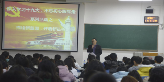为进一步深入学习贯彻党的十九大精神,2017年11月28日,工商学院“深入学习十九大,不忘初心跟党走”系列主题活动之一的“描绘新蓝图,开启新征程”学习活动在进学楼1-1教室举行。活动由工商学院党委副书记陈劲松主持、学院近两百名师生党员参加。