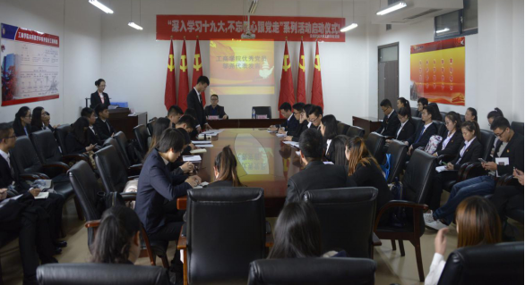 本次启动仪式由工商学院党委副书记范嘉虹老师致辞并宣布启动仪式开始,她在发言中谈到作为党的新生力量应该坚持党的基本路线,贯彻落实十九大精神。党委副书记陈劲松老师解读了在十九大会议报告中,中国特色社会主义进入新时代,我国社会主要矛盾已经转化为人民日益增长的美好生活需要和不平衡不充分的发展之间的矛盾。党员是实践“不忘初心,牢记使命”的先行者,要长久的学习十九大精神。学生第四党支部优秀党员邬尧代表党员发言中说到,作为一名学生党员要时刻关心国家时事,把建设国家为己任。