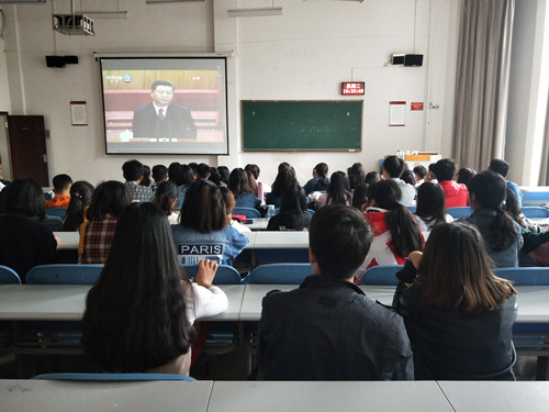 2019年4月30日上午10时30分,纪念五四运动100周年大会在北京人民大会堂举行。中共中央总书记、国家主席、中央军委主席习近平出席大会并发表重要讲话。工商学院组织125名团员青年在进学楼1-2集中收看大会直播。