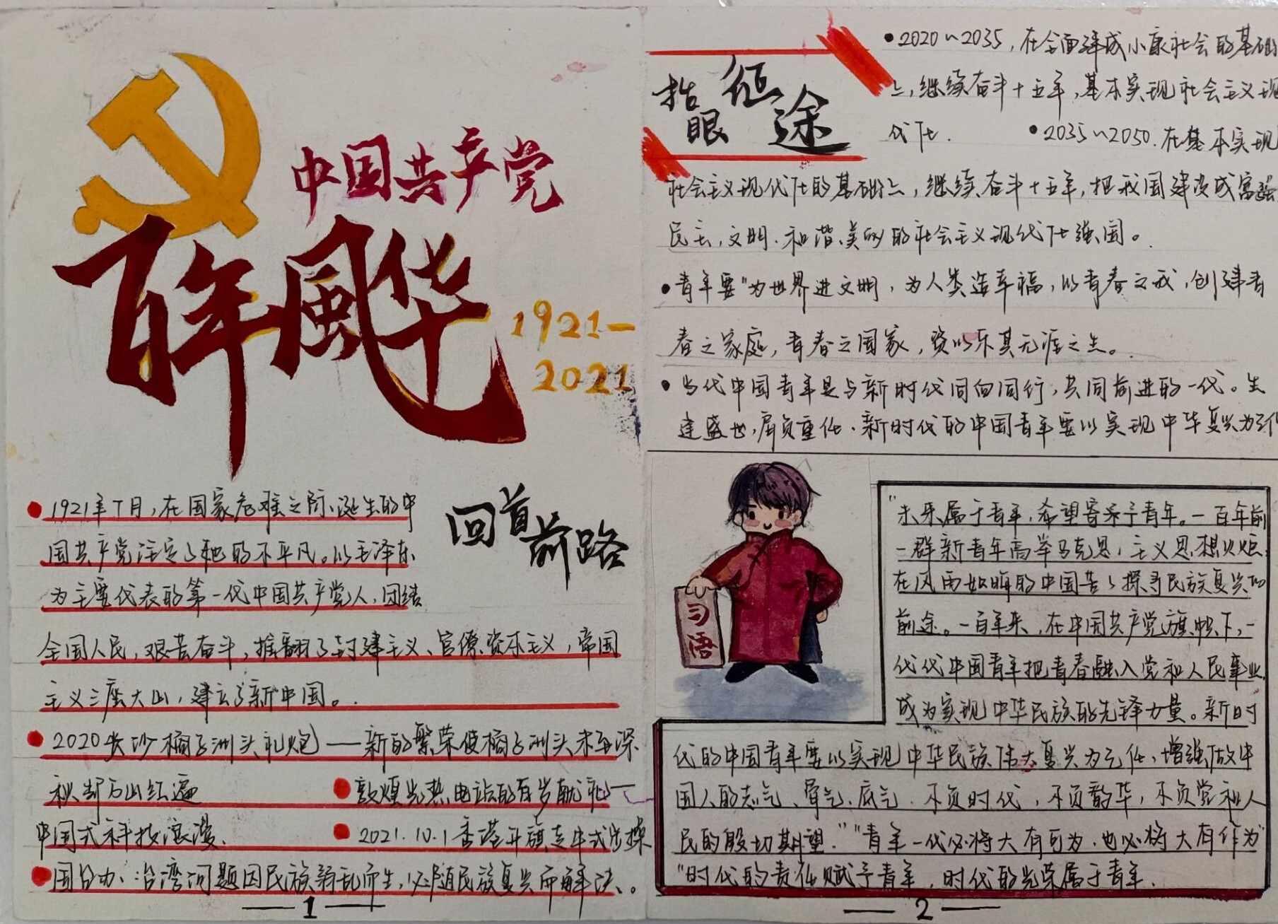 本次大赛以同学们喜爱的手帐形式,通过手绘、贴纸、胶带拼贴等,描绘中国共产党100年来发生的重大事件、熟知的英雄人物和需要弘扬的伟大精神。经过评选,2019级市场营销一班何启碧获得一等奖;2021级工商管理类一班王雪怡,2019级物流管理二班李悦获得二等奖;2019级物流管理一班李秋㽛、2019级物流管理一班李萍、2019级人力资源管理一班卢思念获得三等奖;2021级旅游管理类二班马茂琦、2019级人力资源管理二班周红、2021级工商管理类二班胡盈盈、2021级工商管理类二班蔡莉获得优秀奖。