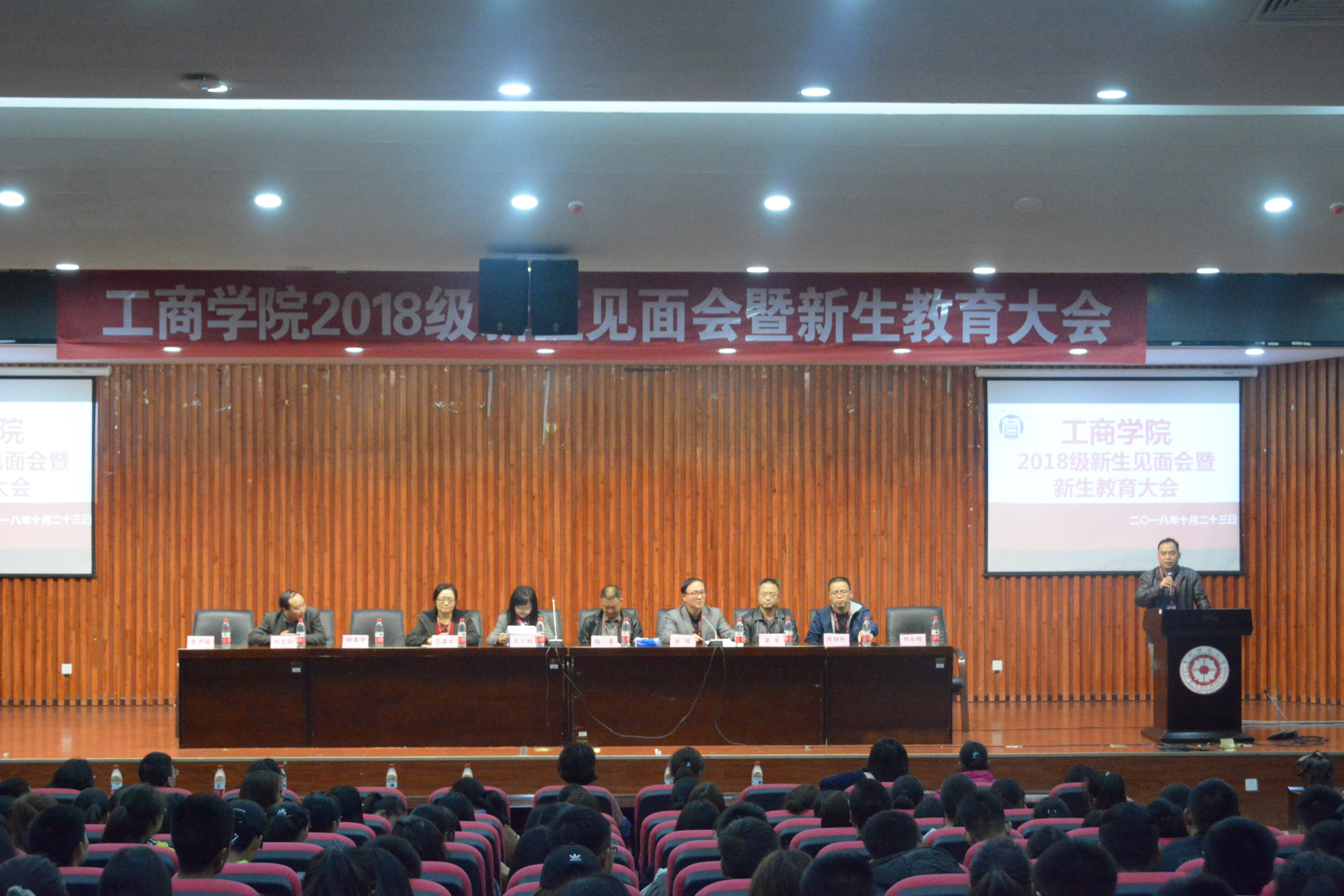 10月23日下午,工商学院2018级新生见面会暨新生教育大会在图书馆报告厅举行。副校长杨勇教授、工商学院领导、各专业负责人、各科室工作人员及全体2018级新生参加大会。会议由工商学院余颂书记主持。