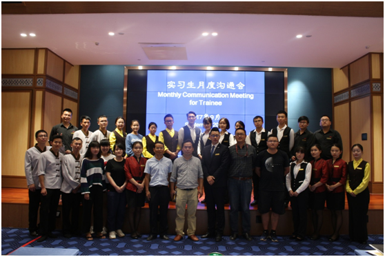 根据我校“儒魂商才”人才培养方案,为保障2014级工商学院旅游系实习生顺利完成专业实习,工商学院副院长胡北明、旅游管理系主任及实习带队老师舒小林、会展经济与管理教研室主任王超、实习带队老师李超四位老师于2017年9月5日赴贵安新区群升豪生大酒店加该批次实习生的月度实习生沟通会,亲切看望了36名2014级专业实习生。