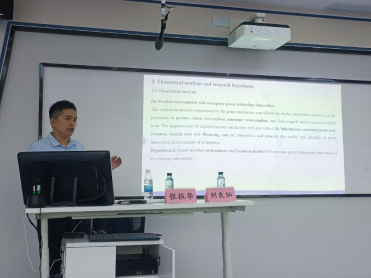 讲座伊始,刘良灿教授对张振华老师的到来表示热烈欢迎,并向与会师生详细介绍了张振华老师,希望大家主动交流、能有所获。随后,张振华老师从引言、理论分析和研究假设、模型参数设立、实证检验和结论五个部分分享了其以“”新能源政策能够推动新能源企业绿色技术创新吗?——来自新能源示范城市的证据”为题的学术论文,详细介绍了论文的研究背景、研究对象、创新点、研究方法等主要内容。在论文讲解之后,张振华老师分享了在识别因果关系、公共政策效果评估两方面的常用研究方法。张振华老师还就“气候政策和绿色全要素生产率:基于可持续发展的角度”的主题向大家提出了征稿邀请。